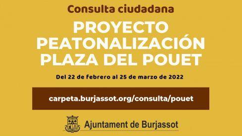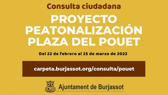 Durante todo un mes, del 22 de febrero al 25 de marzo, el Ayuntamiento de Burjassot va a impulsar una consulta ciudadana para la posible futura peatonalización del entorno de la Plaza del Pouet. A través de una plataforma digital creada para tal fin, carpeta.burjassot.org/consulta/pouet, los vecinos podrán votar el proyecto de peatonalización de esta emblemática plaza de Burjassot, ubicada en pleno casco antiguo, en el mismo entorno de monumentos tan icónicos como El Castell o la Iglesia de San Miguel Arcángel y muy cercana también al nuevo parque municipal de María Marzo.