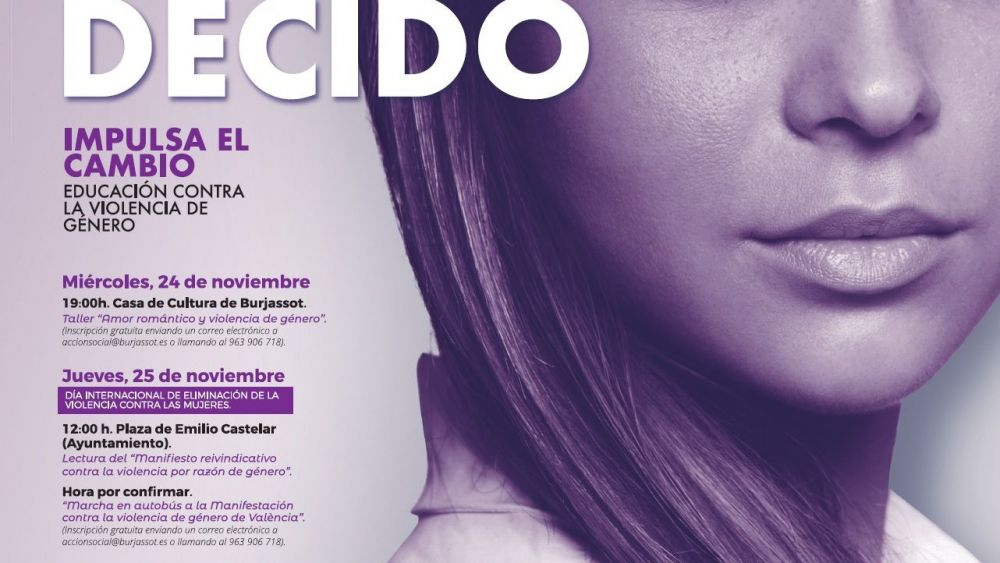 “Yo decido. Impulsa el cambio. Educación contra la violencia de género”. Este es el mensaje que desde el Ayuntamiento de Burjassot, a través de la Concejalía de Igualdad y Feminismo, dirigida por el propio Alcalde de la localidad, Rafa García, se va a transmitir a lo largo de todo el mes de noviembre en el municipio para conmemorar el Día Internacional de la eliminación de la violencia contra las mujeres.