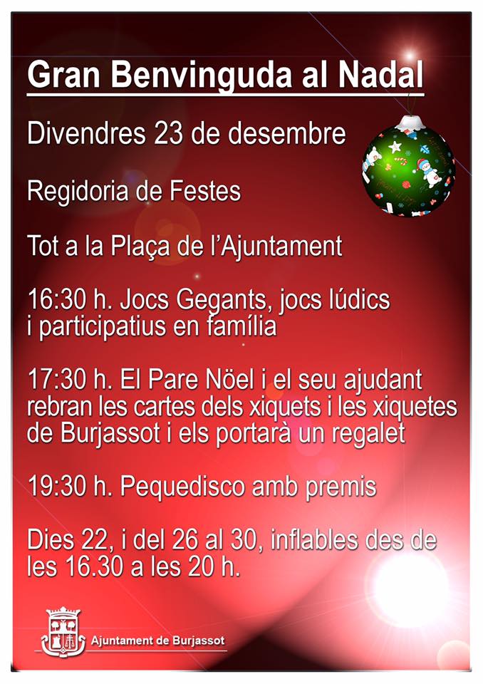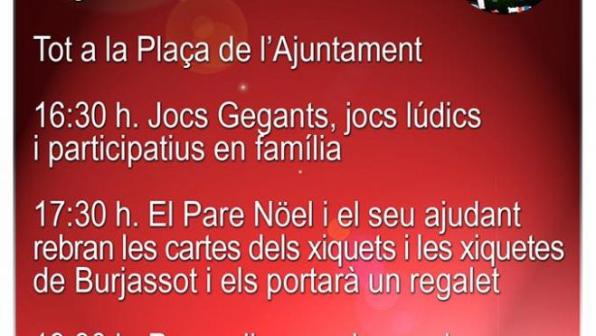 El próximo viernes 23 de diciembre la Plaza del Ayuntamiento de Burjassot se va a transformar para dar la bienvenida a la Navidad. Una tarde de juegos, música, ambientación navideña, premios y un sinfín de sorpresas programada desde la Concejalía de Fiestas del Ayuntamiento de Burjassot, dirigida por Manuel Pérez Menero, con el Grupo A Riure como artífice de las actividades. A las 16:30 horas se iniciará esta tarde con juegos lúdicos y participativos para toda la familia; juegos gigantes que sorprenderán a todos los presentes en la plaza que contará con ambientación musical muy navideña. Una más tarde, a las 17:30 horas, Papa Noel hará un alto en su camino en Burjassot y recibirá, junto a su ayudante, a todos los niños y las niñas de Burjassot que quieran entregarle su carta. Papa Noel, además de recibirles y escuchar sus deseos y peticiones traerá un regalito para todos los que le visiten. Para terminar la tarde, sobre las 19:30 horas, todos bailarán al ritmo de la pequedisco de los duendes de la Navidad y mostrar sus dotes como bailarines. Además de esta tarde tan especial, la Concejalía va a instalar, en la misma Plaza del Ayuntamiento, los días 22 y del 26 al 30 de diciembre colchonetas inflables para que los peques de la casa puedan disfrutar de lo lindo de sus tardes de vacaciones, jugando sin necesidad de salir de Burjassot.
