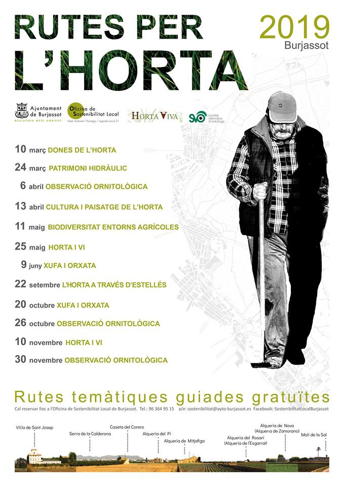 Tras la Ruta por la Huerta a través de Estellés llegará, el 20 de octubre, una nueva ruta centrada en el cultivo de la chufa, mientras que la salida del 26 de octubre incluirá una interesante observación ornitológica, para la cual se contará con la colaboración habitual de la Societat Valenciana d’Ornitologia. El 10 de noviembre, la ruta se centrará en la cultura del vino y el cultivo de la uva mientras que la Ruta por la Huerta del 30 de noviembre volverá a tener como protagonistas a las aves de Burjassot con una nueva observación ornitológica.
