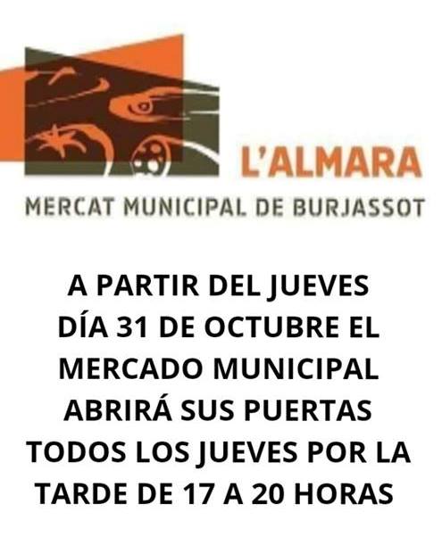 El Mercado Municipal l'Almara de Burjassot quiere facilitar en todo lo posible a las y los ciudadanos del municipio que realicen sus compras en este espacio. Por este motivo, y contando con la colaboración de la Concejalía de Mercados, dirigida por Rosa Coca, va a abrir a partir de esta semana todos los jueves por la tarde.