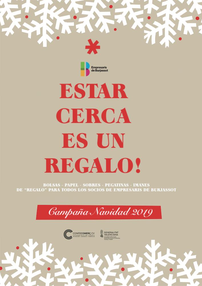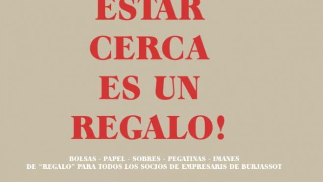 La asociación Empresaris de Burjassot ha presentado su campaña de Navidad 2019 con el lema “Estar cerca es un regalo”, una iniciativa que cuenta con la colaboración de la Confederación Valenciana de Comercio y Servicios (CONFECOMERÇ CV) y de la Generalitat Valenciana. La campaña, que tiene como objetivo que los ciudadanos y ciudadanas compren sus regalos de Navidad en las empresas de Burjassot, consiste en la distribución, entre todas las empresas de la entidad que lo soliciten, de un lote exclusivo navideño compuesto por bolsas de compra, sobres y papel de Regalo, además de pegatinas e Imanes, que servirán, tanto para decorar sus negocios como para regalar a los clientes.