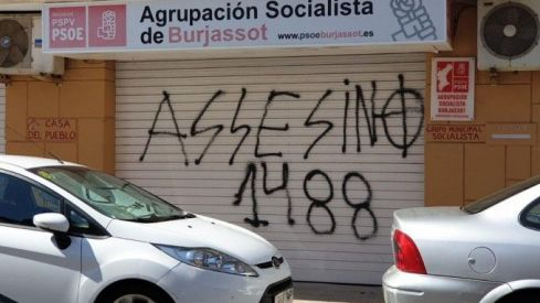 La sede del PSPV-PSOE en Burjassot ha amanecido este domingo con una pintada en la que se puede leer 'Assesino' y los números 1488, asociados popularmente al nazismo.