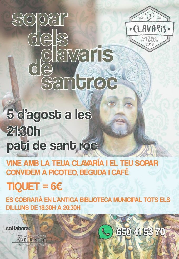 Así, desde la Clavaría, invitan a los Clavarios Mayores que ha tenido la fiesta, junto a sus Clavarías, a disfrutar de una cena de hermandad el 5 de agosto a partir de las 21:30 horas en el inigualable entorno del Patio de Los Silos. Una cena en la que cuentan con la colaboración del Ayuntamiento de Burjassot, desde la Concejalía de Fiestas, dirigida por Manuel Pérez Menero.