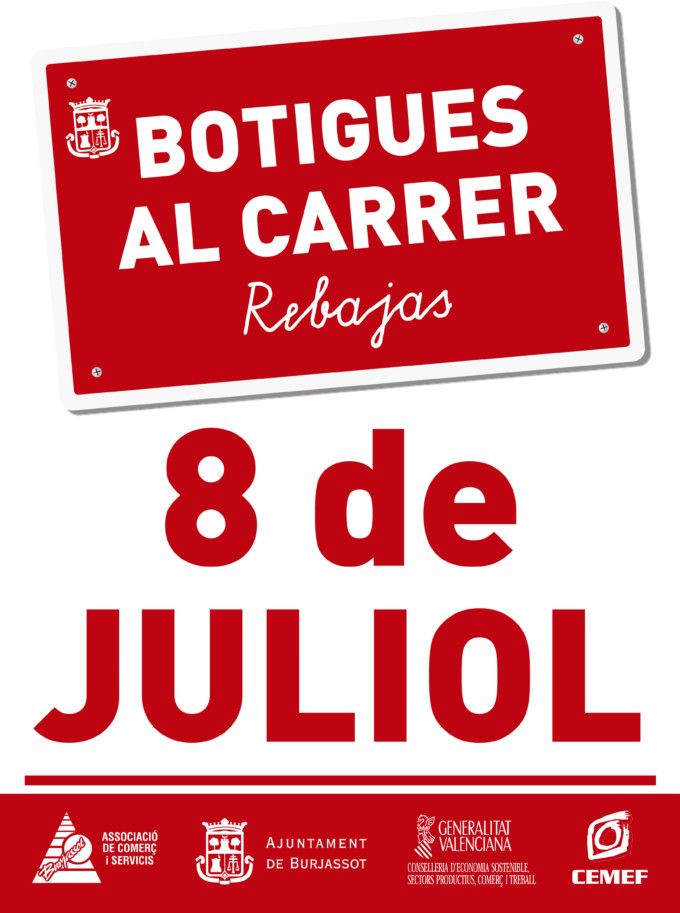 Son días de rebajas y los comercios de Burjassot quieren que los ciudadanas y ciudadanas del municipio se beneficien de los recomendables descuentos que se están ofreciendo en los establecimientos. Por ello, la Asociación de Comercio y Servicios de Burjassot, con la colaboración de la concejalía de Promoción Económica, dirigida por Roc Senent, a través de CEMEF, ha organizado una nueva jornada de “Botigues al carrer”, que tendrá lugar el sábado 8 de julio.