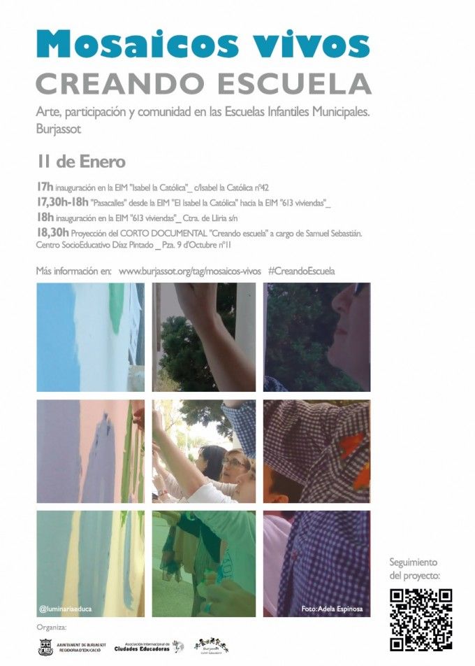 Como iniciativa de la Concejalía de Educación, dentro del Plan Burjassot Ciudad Educadora, la iniciativa de innovación educativa “Mosaicos Vivos. Creando Escuela” ha estado desarrollándose desde el pasado mes de octubre y ahora, con el 2018 recién estrenado, es hora de dar por concluido este proyecto comunitario y, sobre todo, de ver y disfrutar de los resultados en las Escuelas Infantiles Municipales.