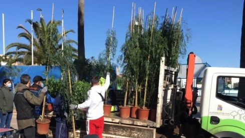 En grupos mixtos se plantaron 30 ejemplares de falsas pimientas y 15 de Viburnum lucidium (cipreses) en alcorques urbanos de la zona de calle ecológica, ubicada junto al polideportivo.