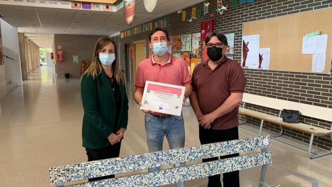 La alcaldesa de Museros, Cristina Civera, junto al concejal de Educación, Agustín Muedra, han visitado esta semana los centros educativos del municipio para entregarles los bancos de polietileno reciclado.