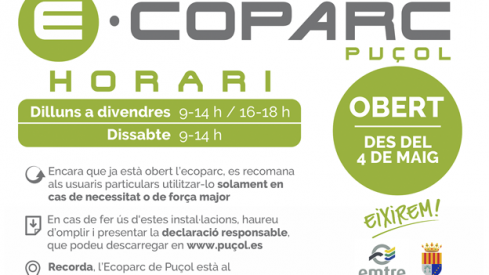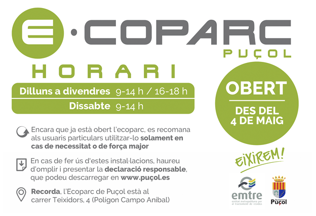 Tras consultar a la Delegación del Gobierno de la Comunitat Valenciana sobre la conveniencia de reabrir los puntos limpios, EMTRE anuncia la reapertura de todos sus ecoparques fijos, entre ellos el de Puçol, abierto desde el 4 de mayo con su horario habitual: de lunes a viernes, de 9 a 14 horas y de 16 a 18 horas, además de los sábados por la mañana.