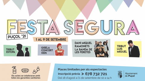 No ha sido posible y un año más se trasladan las Fiestas Populares y Patronales de Puçol: todos los actos con amplia participación de vecinos no se pueden llevar a cabo y retrasan a septiembre de 2022, por tanto los festeros deben esperar otro año para presentar su programa completo de actividades.Este año, tras la reunión de Ayuntamiento, Cofradía y Festeros se ha acordado realizar una pequeña programación, respetando las medidas sanitarias, bautizada como Festa Segura.La necesidad de evitar aglomeraciones afecta a los actos de mayor participación de las fiestas, ya sea en el ámbito religioso (romería al Cabeçol, procesiones), como las actividades de los festeros (entrada de la murta, conciertos) o la programación a cargo del Ayuntamiento de Puçol (volta a peu, noche de paellas, cabalgata, actuaciones musicales).Por ello, se ha apostado por la prudencia y el respeto a las medidas sanitarias actuales, aplazando por segundo año consecutivo los grandes eventos de la programación. Este mes de septiembre lo que sí se va a realizar es una Festa Segura, con actos de poca afluencia donde sea fácil mantener la distancias y respetar todas las medidas de seguridad, incluido el uso obligatorio de la mascarilla.Las Festeras y festeros se han encargado de organizar cuatro torneos con inscripción previa: truc, parchís, pádel y galotxa. La asistencia de público está permitida pero con limitaciones.Por su parte, la Cofradía de la Virgen al Pie de la Cruz ha preparado una serie de actos religiosos que se celebran exclusivamente en el interior de la parroquia, al mismo tiempo que aumentan el horario de apertura y el número de celebraciones eucarísticas, para facilitar que todos los vecinos que lo deseen puedan asistir.Por último, la apuesta del Ayuntamiento sigue los parámetros de las últimas actividades culturales programadas en Puçol: conciertos al aire libre, en la plaza del País Valencià, gratuitos, con inscripción previa, control de acceso, todos sentados con separación de sillas y mascarilla obligatoria.