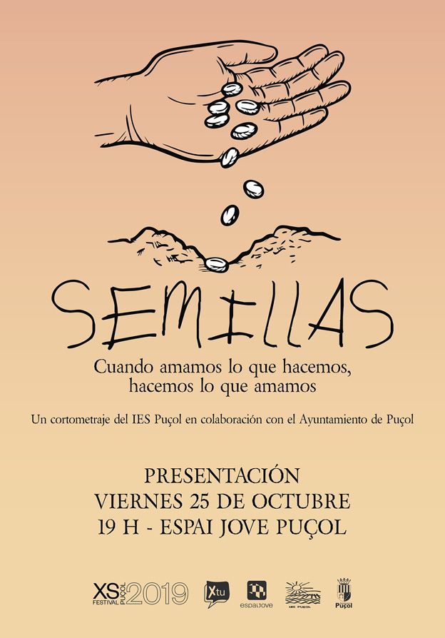 Semillas se estrena el viernes 25, a las 18 horas, en el acto de inauguración del festival XS Puçol. Tras la proyección, habrá un debate moderado por Irene Rodrigo con participación de los alumnos, el instituto y el ayuntamiento, en el que se tratará la trayectoria del centro educativo y, en especial, la figura de Vicent Ribes. Para finalizar el acto, la concejala Ángela Santamaría será la encargada de entregar el premio L’Altra Mirada a la directora del centro, Pilar Millán. Y, a continuación, se celebrará la primera sesión de cortometrajes a concurso.