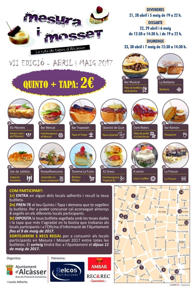 El municipio de Alcàsser disfrutará, durante tres fines de semana seguidos, de la gastronomía de calidad, gracias a la VII edición de 'Mesura i Mosset'. Exquisitas tapas a precios populares, que llenarán las calles de un gran número de vecinos dispuestos a elegir la mejor tapa de esta edición.