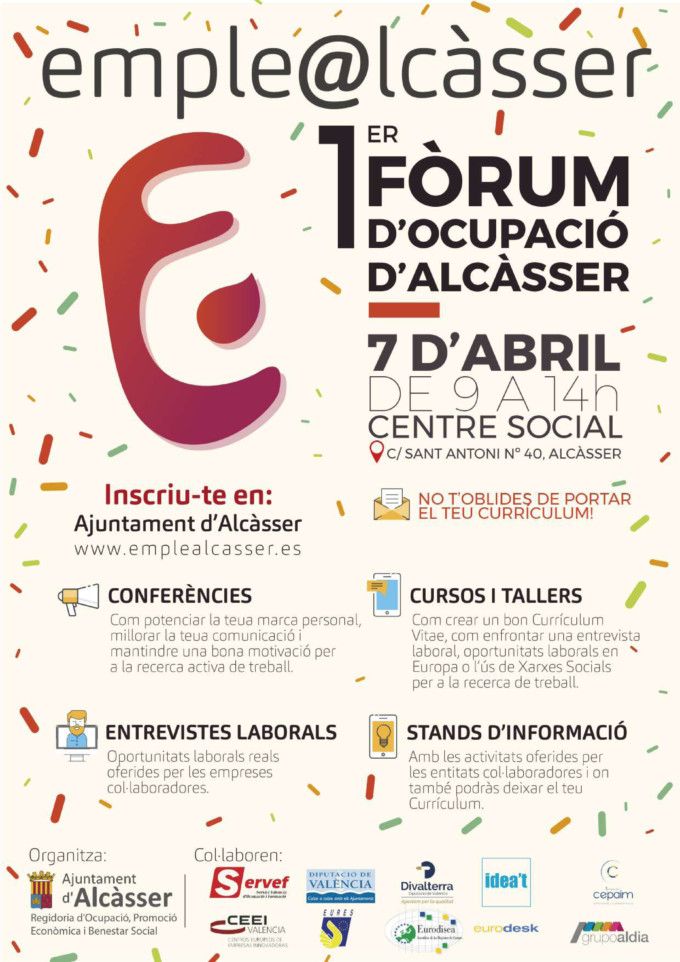 La Concejalía de Empleo, Promoción Económica y Bienestar Social, del Ayuntamiento de Alcàsser, organiza el viernes 7 de abril, el I Foro de Empleo de la localidad.