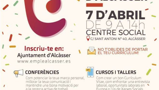 1r Foro de Empleo de Alcàsser: viernes, 7 de abril, en el Centro Social de Alcàsser (C/ Sant Antoni, 40) de 9 a 14 horas. Programación e Inscripciones en www.emplealcasser.es o en la Oficina de Información del Ayuntamiento de Alcàsser (hasta el 6 d’abril).