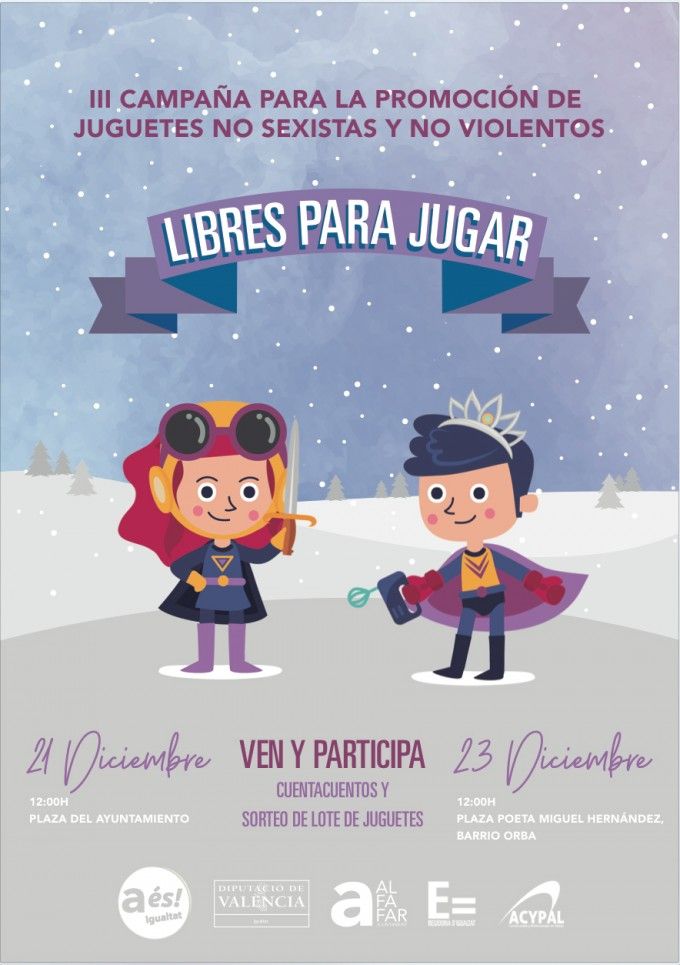 Alfafar, a través de su concejalía de Igualdad, ha puesto en marcha la tercera edición de la campaña para fomentar el uso de juguetes no sexistas y no violentos entre la población más joven del municipio.Bajo el lema “Libres para jugar”, l’Ajuntament busca concienciar a la población de Alfafar en el juego libre por parte de los niños y niñas, libre de estereotipos y roles de género. Así, la campaña se difundirá en los centros educativos de Alfafar y, en esta edición, la campaña contará con el proyecto piloto de Peque Radio en el que ha participado el alumnado de 5 y 6 de primaria de diferentes centros.