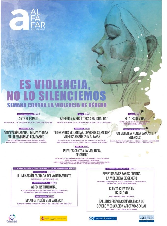 El lunes 25 de noviembre a las 11.30h tendrá lugar el acto institucional en la plaza del Ayuntamiento que incluirá la performance “Pasos contra la Violencia de Género” y, a las 18.30h, se organizará un punto de encuentro para acudir a la manifestación del 25N en Valencia.