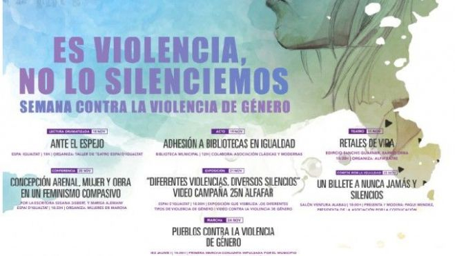 Entre las diversas acciones que se realizarán a lo largo de estas semanas, l’Espai d’Igualtat organizará talleres de teatro, actos como la adhesión a la iniciativa Bibliotecas en Igualdad, conferencias sobre mujer y feminismo o exposiciones y visualizaciones de vídeos relacionados con la violencia de género. Uno de los platos fuertes será la marcha “Pueblos contra la Violencia de Género”, impulsada por Alfafar y realizada junto a los municipios de Massanassa y Benetússer el próximo domingo 24 de noviembre.