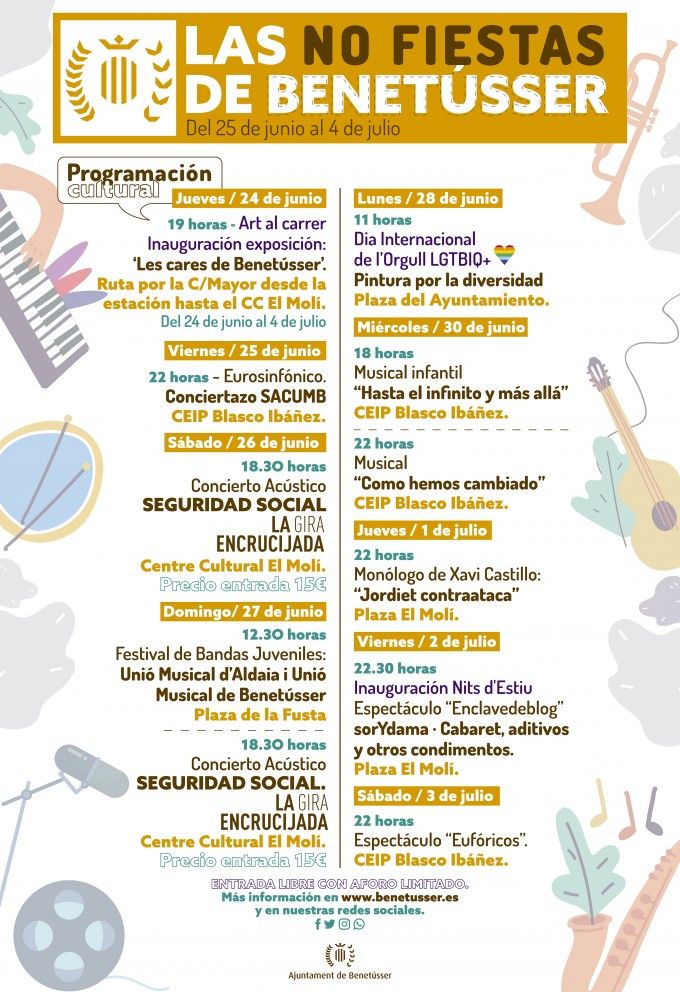 En Benetússer, la última semana de junio y la primera de julio marcan el inicio del verano, una fecha destacada en el calendario municipal gracias a la tradicional celebración de sus Fiestas Patronales con eventos multitudinarios en calles y plazas de la localidad. Sin embargo, debido a la actual situación sanitaria, el Ayuntamiento de Benetússer ha decidido apostar para este 2021 por unas #NoFiestas, caracterizadas por una programación responsable, en la que la ciudadanía pueda disfrutar de espectáculos para todos los públicos en espacios abiertos y con aforo limitado para garantizar el cumplimiento de las medidas sanitarias. "Estamos deseando retomar la vida festera de Benetússer, tan rica y participativa en todas las edades, pero consideramos que no es momento de relajarnos. Debemos continuar siendo responsables y ofrecer alternativas culturales atractivas y seguras a nuestros vecinos y vecinas para superar juntos la pandemia", destaca la alcaldesa de la localidad, Eva Sanz.De este modo, del 24 de junio al 4 de julio, Benetússer contará con una completa programación de actos, mayoritariamente vespertinos y nocturnos, en los que los espectáculos musicales con aforo limitado serán los grandes protagonistas. El primer día, a las 19 horas se inaugurará la exposición ‘Les cares de Benetússer’ en una apuesta por llevar el arte a la calle mediante una ruta de pancartas con fotografías de vecinos y vecinas del municipio a lo largo de la c/ Constitución y c/Mayor hasta llegar al Centre Cultural El Molí. El viernes 25 de junio se celebrará el conciertazo de SACUMB, Eurosinfónico, un evento en el que la banda benetusina acompañará a grandes cantantes para recordar los grandes éxitos eurovisivos.Durante el fin de semana, 26 y 27 de junio, llegará uno de los platos fuertes de las #NoFiestas con los dos conciertos acústicos del mítico grupo Seguridad Social a las 18.30 horas en el Centre Cultural El Molí. Durante la entrevista para el podcast municipal, ‘Ilustres de Benetússer’, el cantante y líder del grupo, José Manuel Casañ, ya avanzó que esta modalidad de espectáculo hace posible una mayor interacción con el público ya que permite a los artistas contextualizar las canciones y crear una situación de intimidad con los asistentes. El mismo domingo 27 de junio, a las 12.30 horas también tendrá lugar el Festival de Bandas Juveniles en la plaza de la Fusta, con el encuentro entre la UM de Aldaia y la UM de Benetússer.El 28 de junio, festivo local y Día Internacional del Orgullo LGTBIQ+, a las 11 horas está previsto el pintado, por parte de la ciudadanía, de múltiples bancos de madera situados en la plaza del Ayuntamiento con los colores de la bandera arcoíris como muestra de celebración y respeto a la diversidad social.El 30 de junio, la localidad disfrutará de musicales por partida doble con Hasta el infinito y más allá a las 18 horas dirigido al público más infantil y Como hemos cambiado a las 22 horas, ambos en el patio del CEIP Blasco Ibáñez. El 1 de julio, la plaza El Molí acogerá el monólogo de Xavi Castillo, Jordiet Contraataca, y el 2 de julio se inaugurarán las Nits d’Estiu a las 22.30 horas con sorYdama, un espectáculo de Enclavedeblog. Finalmente, el día 3 de julio el CEIP Blasco Ibáñez acogerá el espectáculo Eufóricos a las 22 horas. "Durante el periodo en el que habitualmente disfrutamos de nuestras fiestas, este año apostamos por espectáculos a la fresca para reencontrarnos poco a poco con la cultura en un contexto en el que la salud sigue siendo nuestra prioridad", indica Denis Madrid, concejal de Fiestas de Benetússer.Todas las actividades tendrán entrada libre y gratuita hasta completar aforo, excepto los dos conciertos de Seguridad Social, cuyas entradas pueden adquirirse a través del siguiente enlace: https://bit.ly/2SMxhEd