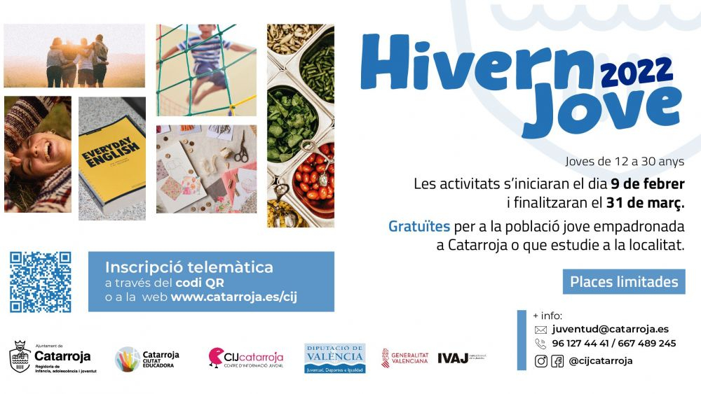 Este viernes 28 de enero se abre el periodo de inscripción para las actividades que componen la programación Hivern Jove 2022, el programa de actividades gratuitas destinado a la población juvenil, desde primero de la ESO hasta los 30 años, que esté empadronada en Catarroja o que estudie en alguno de los centros educativos de la localidad. La concejalía de Juventud continúa, de esta forma, apostando por consolidar la participación de la población juvenil dando respuesta en su programación a las necesidades formativas y de ocio de la juventud del pueblo.