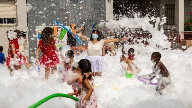 Durante los meses de julio y agosto, alrededor de 120 niños y niñas de Mislata, con edades comprendidas entre los 3 y 17 años, han acudido al campamento social de verano, organizado por la concejalía de Bienestar Social para ayudar a las familias mislateras con más necesidades a poder conciliar su vida laboral mientras los niños no tienen clases. Ya a las puertas del inicio del nuevo curso escolar, el programa culminaba ayer con una gran fiesta de la espuma para los niños y niñas participantes. Debido a las circunstancias derivadas de la crisis sanitaria, al igual que ocurrió en la pasada edición, el programa ha seguido un estricto protocolo para garantizar la seguridad de los y las menores. Para el alcalde, Carlos F. Bielsa, "desde el equipo de gobierno tenemos un claro compromiso de dar respuesta a las necesidades sociales de todas aquellas personas que lo están pasando mal; es por ello que hemos realizado de nuevo un gran esfuerzo para crear un entorno seguro donde estos niños y niñas pudieran pasarlo bien y, lo más importante, garantizarles una alimentación durante sus vacaciones". El programa, que se ha convertido en todo un referente nacional tras casi ya una década de funcionamiento, se enmarca dentro de las políticas para las personas que desarrolla el Ayuntamiento de Mislata, que se convirtió en el primer consistorio valenciano que abrió los comedores escolares en verano, después de que Servicios Sociales detectara que muchas familias tenían dificultades para cubrir las necesidades nutricionales de sus hijos e hijas en períodos vacacionales.Los niños y niñas recibían cada día la comida en las propias instalaciones del colegio Ausiàs March, y se les entregaba la merienda y el desayuno del día siguiente. Y aparte, como apunta el concejal de Bienestar Social, Ximo Moreno, "los niños y niñas han contado siempre con la presencia de monitores titulados que han diseñado varias actividades lúdicas compatibles con la situación actual".
