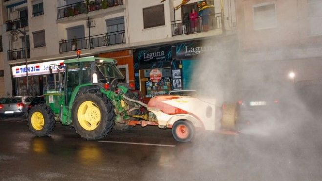 Con la ayuda de tractores con pulverizadores en hélice, se ha iniciado este servicio de fumigación de las calles con una solución de hipoclorito de sodio. Un servicio que se realizará siempre en horario nocturno y se prolongará durante los días que dure el estado de alarma.