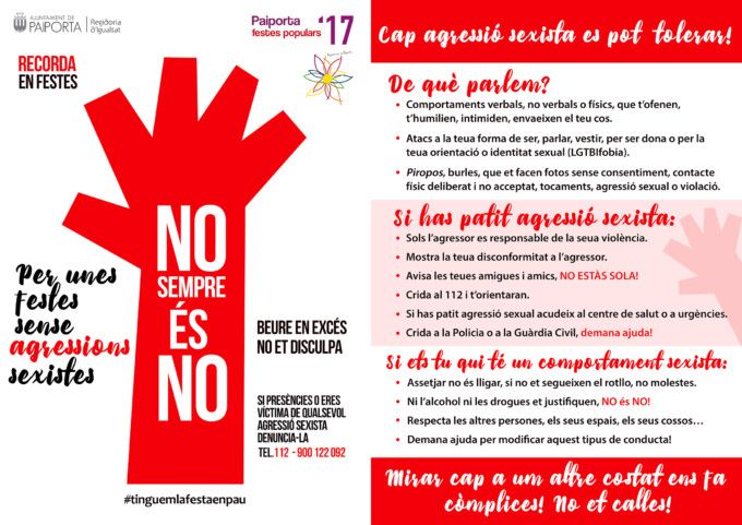 La concejalía de Igualdad del Ayuntamiento de Paiporta ha iniciado una campaña de concienciación contra las agresiones sexistas con motivo de las Fiestas Populares 2017, que se inician este jueves y se prolongarán hasta el 17 de agosto. La campaña consiste en el reparto de información al respecto de esta problemática, que lamentablemente está presente en algunas celebraciones que implican la acumulación de público. La campaña lleva como título 'No siempre es no', y también se puede seguir en redes sociales con la etiqueta #tinguemlafestaenpau.