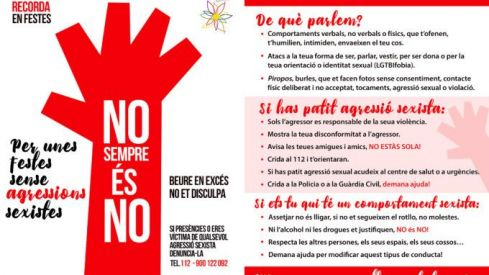 Además del cartel con la imagen de la campaña, la concejalía de Igualdad también repartirá en las zonas donde está prevista la aglomeración de gente durante las Fiestas Populares información adicional, como es la definición de agresión sexista, los recursos a los cuales se puede acudir en caso de sufrir este tipo de violencia verbal o no verbal, y advertencias a aquellas personas que puedan llegar a agredir a otras.