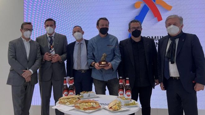 Herick Campos Arteseros, director general de Turismo en Generalitat Valenciana, Bartolomé Nofuentes, teniente alcalde del Ayuntamiento de Quart de Poblet, junto Pablo Mazo, director regional de Relaciones Institucionales de Heineken España, Víctor Pérez, presidente de FOTUR y Sergio Expósito, gerente de la Cafetería Bar Beluga y ganador del galardón, han participado en la presentación en la que se ha mostrado la receta distinguida con este premio.