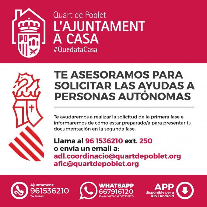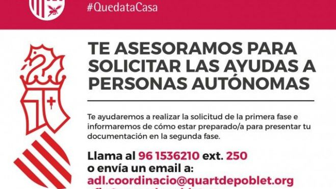 Con la paralización de la mayor parte de la actividad profesional a causa del estado de alarma, los gobiernos central y autonómico han puesto en marcha varias líneas de ayuda destinadas al personal autónomo que se ha visto afectado; ante esta situación, el Consistorio detectó la necesidad de dar respuesta a las dudas que presentaba la ciudadanía y puso en marcha los canales de atención telemáticos necesarios. Desde que empezara la crisis sanitaria ocasionada por la COVID-19, el Ayuntamiento de Quart de Poblet ha realizado un gran esfuerzo de reorganización de las diferentes áreas municipales con el objetivo, no solo de garantizar el mantenimiento de los servicios públicos, sino también de reforzarlos para poder hacer frente a las consecuencias de esta pandemia. Una labor que se ha centrado especialmente en las prestaciones que se realizan a través de la Agencia de Fomento de Innovación Comercial (AFIC) y el Centro de Empleo y Desarrollo (CED), conscientes de las dificultades que atraviesa el tejido productivo, uno de los principales afectados por esta situación.
