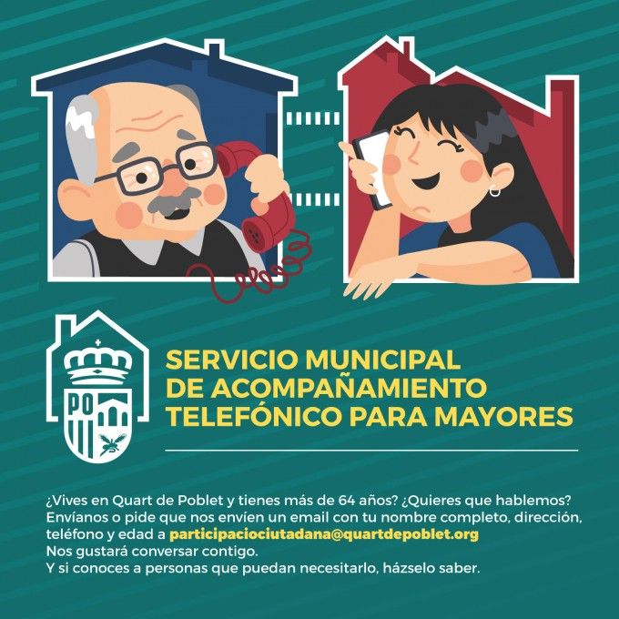 El Ayuntamiento de Quart de Poblet ha puesto a disposición de su ciudadanía más mayor un Servicio de Acompañamiento telefónico, a través del cual el personal municipal se pondrá en contacto con aquellas personas mayores de 64 años que así lo requieran para mantener conversaciones telefónicas. En estos diálogos, en ningún momento se pedirán datos personales o confidenciales, ya que se trata de un espacio para mantener una conversación y acompañar.