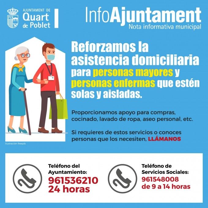El Ayuntamiento de Quart de Poblet ha ampliado el servicio de "Menjar a Casa", incorporando el reparto a domicilio, también, durante los fines de semana y los días festivos mientras dure el estado de alarma y la obligación de confinamiento. Esta prestación se ofrece, con carácter general, a las personas mayores de 65 años que, por sus circunstancias particulares no pueden autoabastecerse de una dieta adecuada, ahora bien, una vez decretado el estado de alarma y, con el cierre de los comedores escolares, el Consistorio identificó nuevos colectivos vulnerables como las familias con menores en situación de riesgo social.