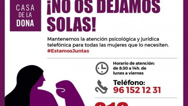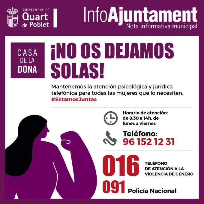 El Ayuntamiento de Quart de Poblet mantendrá los servicios de atención psicológica y el asesoramiento en materia jurídica que ofrece desde la Casa de la Dona de manera telefónica. Así, las mujeres que requieran de este servicio pueden contactar llamando al 961 521 231 de 8:30 a 14 horas. En el caso de una emergencia, se recuerda que se debe llamar al teléfono de atención a las víctimas de violencia de género, el 016 o la policía nacional, al 091, a cualquier hora del día.