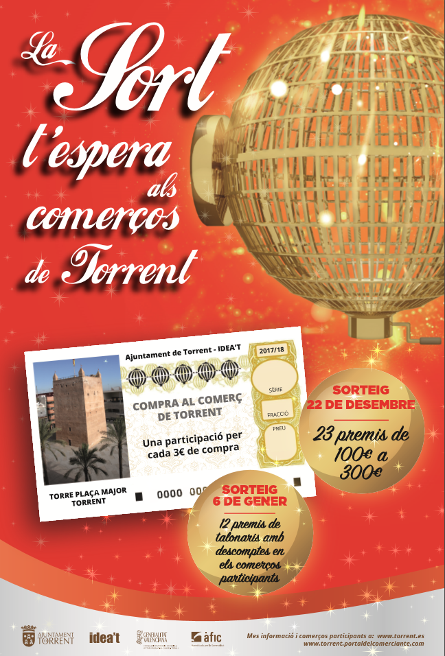 La Navidad llega a Torrent, y el consistorio, mediante la empresa municipal IDÉATE, ha diseñado una campaña para fomentar el comercio local en estas fechas tan señaladas. La campaña navideña “La suerte te espera en los comercios de Torrent” se centra en dos fases: sorteo de Navidad -22 de diciembre de 2017- y sorteo de Reyes -6 de enero de 2018-. En la primera fase se sortearán un total de 23 premios con una bonificación de 100 € a 300 € para gastar en los comercios locales.