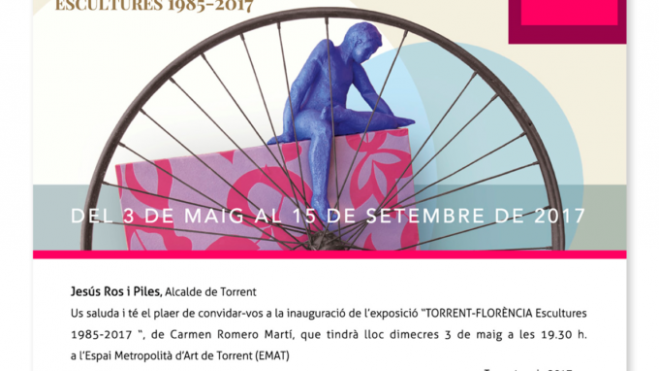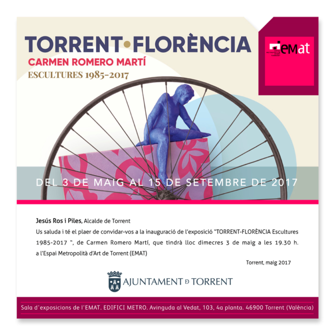 La sala de exposiciones del EMAT (Espai Metropolità d’Art de Torrent) acoge la inauguración de la exposición ‘Torrent – Florència. Escultures 1985 – 2017’ de Carmen Romero Martí. La escultora torrentina presentará una muestra de sus obras que exhibirá en la XI Bienal de Florencia en la modalidad de escultura. Se trata de una selección de obras escultóricas donde la creatividad y la sostenibilidad se unen en un sólo concepto para crear un conjunto de arte y cultura que sea respetuoso con la naturaleza. El acto se iniciará a las 19.30 horas con la presencia de Carmen Romero que explicará a los presentes las claves de su obra. La exposición permanecerá abierta al público hasta el día 15 de septiembre.