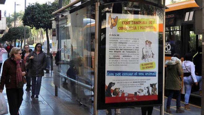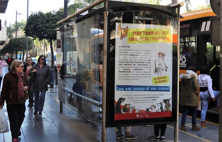 La delegación de Bienestar Animal ha editado unos mupis informativos con las indicaciones para el censo del animal, que se puede hacer a través de la web municipal www.torrent.es –con certificado digital- o de manera presencial en el TDIC (planta baja del Ayuntamiento).