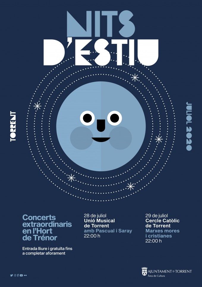 Como broche final a esta programación musical habrá dos conciertos extraordinarios. La joya botánica de Torrent recibirá a la Unión Musical acompañada de Pascual y Saray, que con sus maravillosas voces iluminarán la noche del 28 de julio a las 22 h. En la velada del 29 de julio a las 22 h, subirá a escena el Círculo Católico con un concierto de marchas moras y cristianas, un homenaje a las tradicionales fiestas que este año no podrán realizarse debido a la situación actual. Ambos espectáculos son con entrada libre y gratuita hasta completar aforo. Igualmente, los eventos cumplirán todas las medidas higiénicas y sanitarias para proteger a los torrentinos y torrentinas. Además, los dos conciertos podrán seguirse en directo a través de la página oficial de Facebook del Ayuntamiento de Torrent.