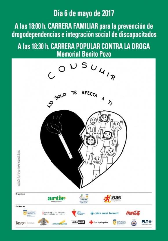 El próximo sábado día 6 de mayo, Torrent acoge la Carrera Popular contra la droga Memorial Benito Pozo y la Carrera familiar para la prevención contra la drogodependencias e integración social de discapacitados. Con el lema ‘Consumir. No sólo te afecta a ti’, ARTIC en colaboración con la Fundación Deportiva Municipal (FDM), han preparado esta jornada solidaria y deportiva, que constará de un circuito urbano.