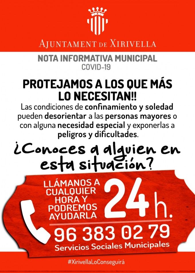 El área de Servicios Sociales del Ayuntamiento de Xirivella ha intensificado las labores de rastreo y localización de las personas en riesgo de aislamiento durante la emergencia sanitaria y el estado de alarma. El consistorio ha reforzado el servicio 24 horas de atención telefónica y ha repartido miles de carteles por toda la población pidiendo la colaboración ciudadana. Se buscan, fundamentalmente, personas mayores pero también personas con necesidades especiales a las que el confinamiento y la soledad les pueda suponer desorientación, peligro o dificultad. Casi una veintena de voluntarios coordinados por el Ayuntamiento repartían esta mañana la cartelería por todas las calles de Xirivella. El mensaje va dirigido directamente a las personas en riesgo de aislamiento pero también a sus vecinos y conocidos. El número al que hay que llamar es el teléfono matriz de los Servicios Sociales municipales: 96 383 02 79. Por otra parte, el consistorio mantiene un operativo de megafonía móvil publicitando a diario este mismo servicio de auxilio a personas necesitadas.
