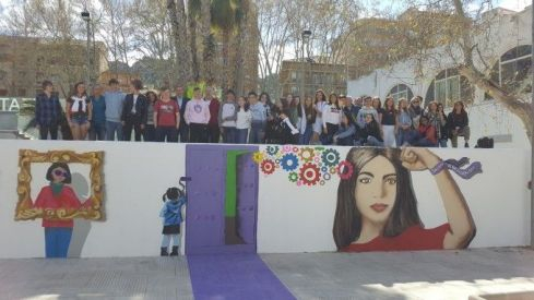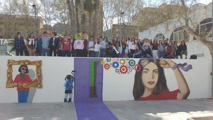 Un grupo de 30 estudiantes del IES José de Ribera y del Coornhert Lyceum de Haarlem (Países Bajos) han llevado a cabo un mural con motivo de la celebración del 8 de marzo, Día Internacional de la Mujer Trabajadora. Los trabajos del mural, ubicado en uno de los accesos al Gran Teatro de Xàtiva, han sido coordinados por los profesores María Gozalbes, Pau Calvo, Haan Allers y Mireille Dreuning. Este mediodía, el alcalde Roger Cerdà y la concejala de Igualdad, Lena Baraza, han participado en un acto de inauguración, junto con el director del instituto setabense, Jacint Martínez Baldó y el profesorado participante en el proyecto.
