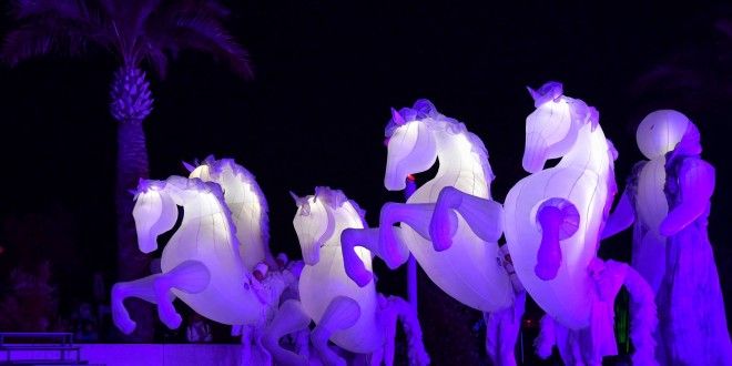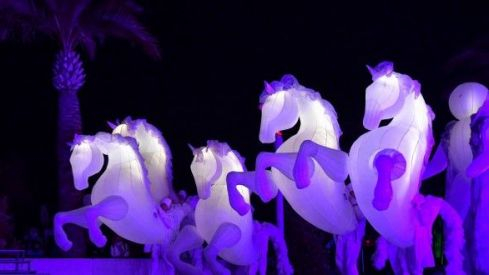 El escenario del campo de La Murta se llenará con un rebaño de caballos, hechos de materiales blancos y marfil, símbolos de paz, pureza y espíritu. Caballos esculpidos en grandes materiales hinchables y manejados por audaces titiriteros vestidos de leyendas. Un paseo de imágenes, una invasión de caballos fantásticos y una transformación de la atmósfera en imágenes de sueño, vivas, una sucesión de imaginario, con un acompañamiento de humo suave, luces nocturnas y sonidos equinos.