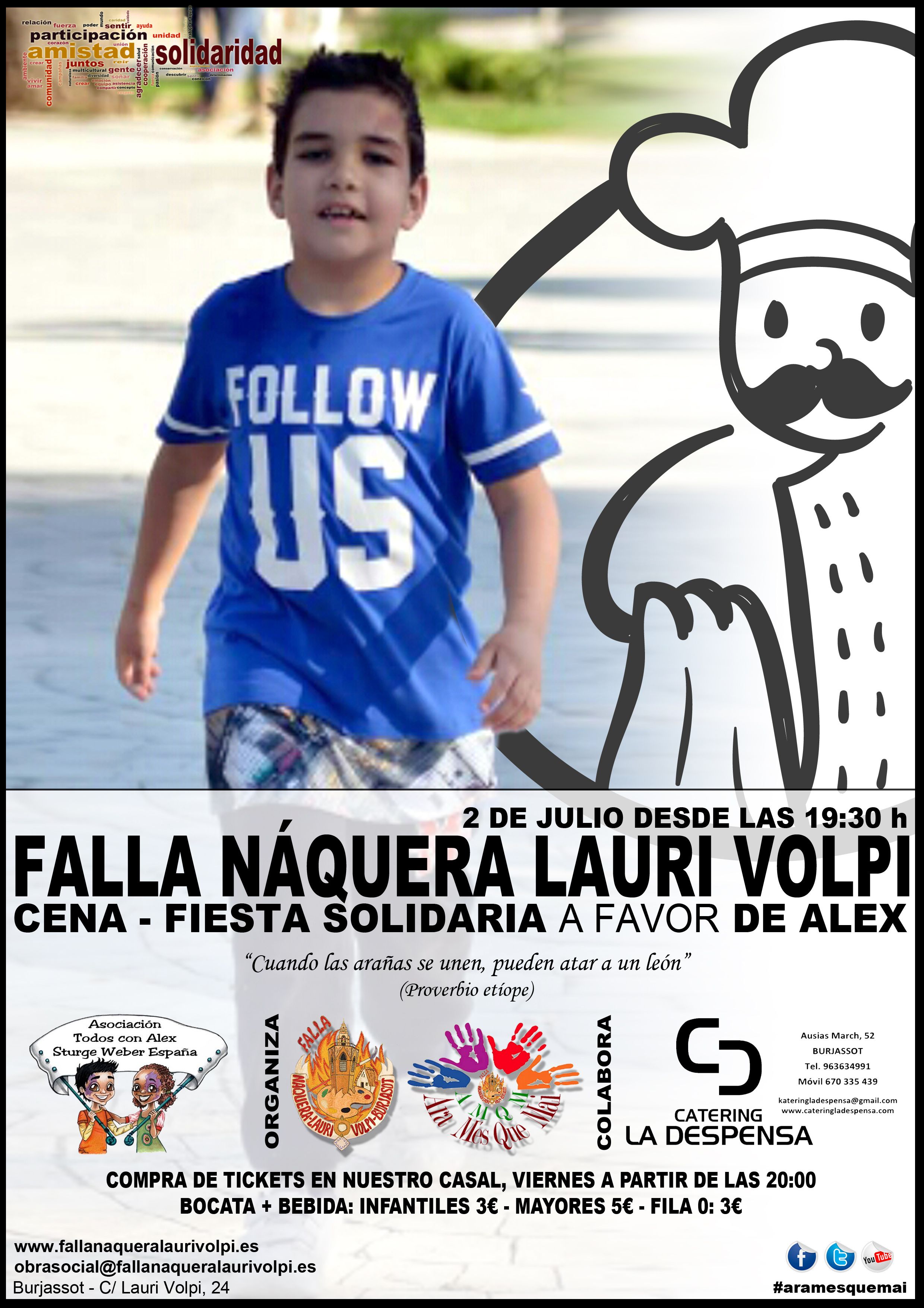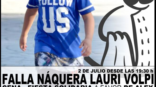 Desde la Falla Náquera-Lauri Volpi, a través de su Delegación de Obra Social, quieren ayudar a Álex y, por este motivo, esta año su ya tradicional Fiesta Solidaria, que se celebrará el 2 de julio a partir de las 19:30 horas en el Casal de la Comisión, destinará todo lo recaudado a ayudar a este pequeño, representado por la Asociación "Todos con Álex".
