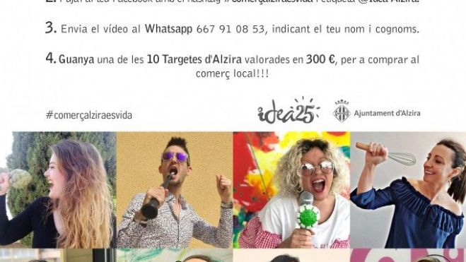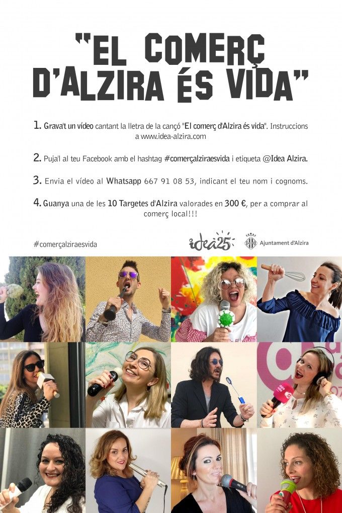 A través de esta campaña se lanza un mensaje de optimismo y se invita participar y cantar por el comercio de Alzira. Es el momento de ser un consumidor más solidario, más sostenible y más responsable que nunca, para que la ciudad vuelva a tener vida, con los establecimientos abiertos. Entre todos los participantes se sortearán un total de 3.000 €, con 10 Tarjetas de Alzira, por importe de 300 € cada una, para destinarlas íntegramente a compras en el comercio local de Alzira.