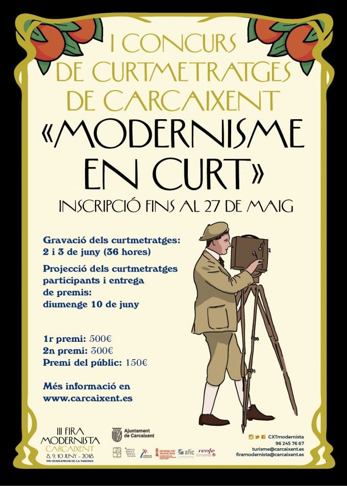 L’Ajuntament de Carcaixent, dins dels concursos programats per a la Fira Modernista, ha posat en marxa la primera edició del concurs de curtmetratges ‘Modernisme en curt”. En este certamen els participants tenen 36 hores per escriure, rodar i editar un curtmetratge d’una durada màxima de 2 minuts i mig de temàtica modernista. El concurs es realitzarà el cap de setmana del 2 i 3 de juny i, els treballs es projectaran el 10 de juny dins del programa d’activitats de la Fira Modernista, previ a l’acte de lliurament de premis.