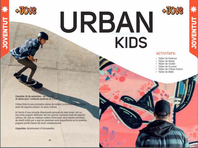 Urban Kids es un evento dirigido a los jóvenes que quieran conocer los deportes urbanos y que llega a la localidad con motivo de la celebración del Mes del Deporte 2019. Un evento deportivo y cultural que tendrá lugar mañana sábado, 28 de septiembre, en el Skatepark de Almussafes e inmediaciones, a partir de las 9 h y hasta las 14 h. Una mañana repleta de actividades, donde las familias tienen el protagonismo y en la que todas las acciones están diseñadas para acercar los deportes urbanos a aquellas personas que no las conozcan y transmitir conocimientos a las que ya están iniciadas en ellos.