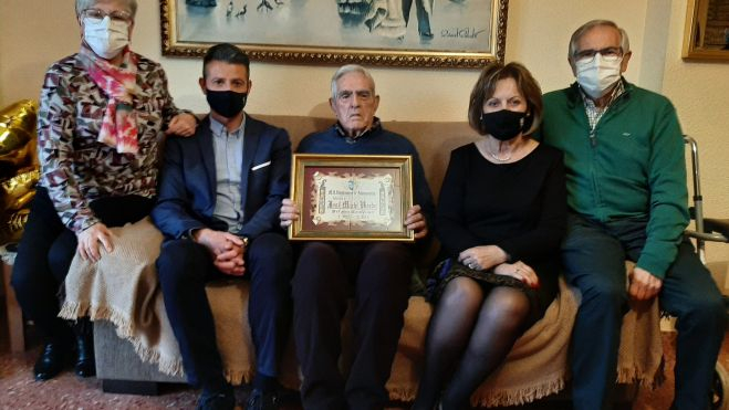 El vecino de Almussafes José Machí Vicedo cumple hoy, lunes 7 de marzo, 100 años y para celebrarlo el Ayuntamiento y la Asociación de Jubilados y Pensionistas de la localidad ya le han hecho entrega de una placa conmemorativa en nombre de toda la ciudadanía. Aunque nació en Barcelona y vivió muchos años en Benifaió, desde hace 25 reside en Almussafes junto a su familia. El alcalde, Toni González, señala que “para el pueblo es una alegría muy grande contar con vecinos como él, que después de tantos esfuerzos y sacrificios disfruta de una vejez tranquila y rodeada del amor y el cariño de su familia”.