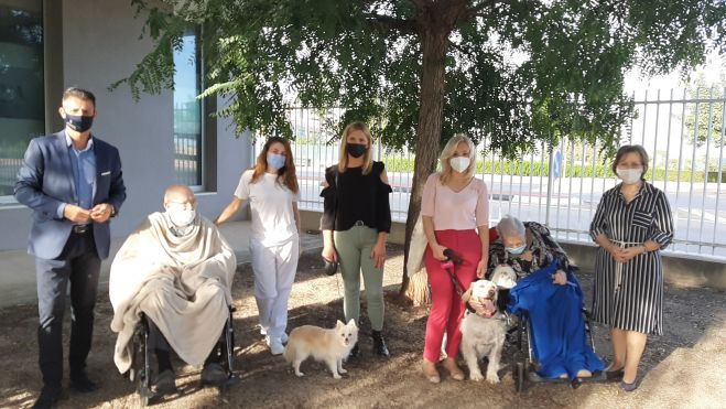 La directora de la infraestructura, Esther Yubero, el alcalde, Toni González, la concejala de Mayores, Paqui Oliver, y la presidenta de la asociación encargada de la actividad, Beatriz Díaz, participaron durante la tarde de ayer en la reacticación del programa, que se ofrecerá periódicamente gracias a la participación de las perras Yuca, de cuatro años, y Chiqui, de siete.