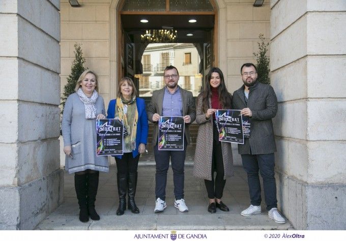 La regidora delegada de Políticas Educativas, Carmen Fuster, el regidor delegado de Cultura, Nahuel González, y la regidora de Políticas Saludables y Cooperación, Liduvina Gil, el presidente de la asociación Policroma, Daniel Ardid, y la directora del Palau Ducal de Borja, Balbina Sendra, han presentado esta mañana la programación del IV Festival Mostra’t Gandia 2020, que tendrá lugar del 29 de enero al 1 de febrero en el Palau Ducal de Borja y al Teatro Serrano.