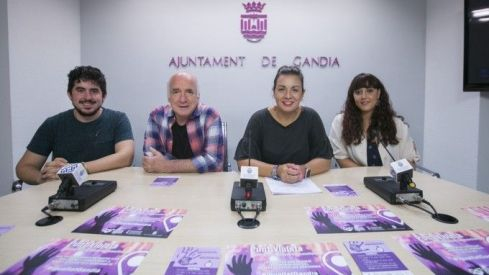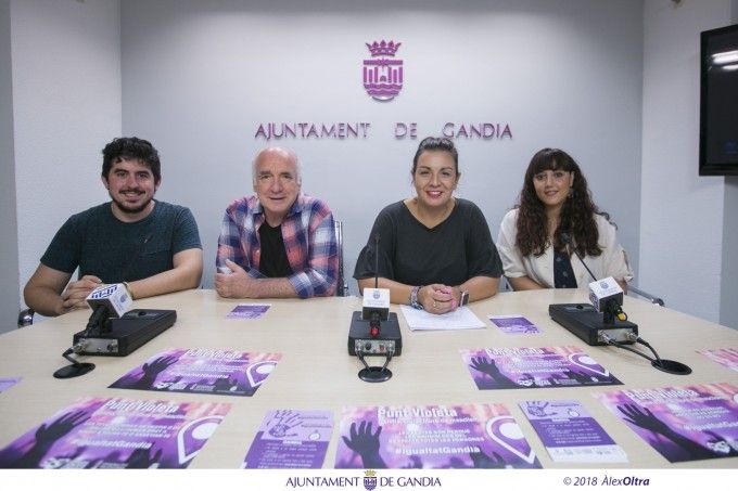 La vicealcaldesa y concejal de Igualdad, Diversidad y Políticas Inclusivas, Lorena Milvaques, acompañada del edil de Cultura, Joan Muñoz, la Agente de Igualdad, Esther Vidal y el presidente del Consell dels Joves de Gandia, Hèctor-Josep Juan Bofí, ha presentado el “Punto Violeta” que el Ayuntamiento instalará durante la Fira i Festes de Gandia 2018.