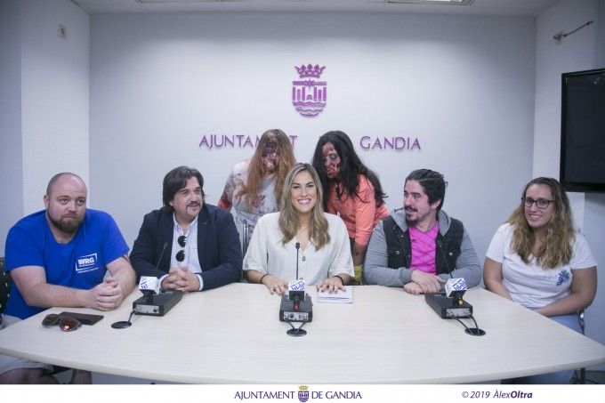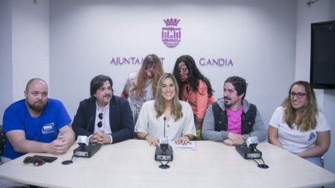 La regidora delegada de Juventud, Lydia Morant, acompañada de los representantes del Consell dels Joves, Hèctor Juan Bofí y Cristina Lena, y de la empresa organizadora WRG, Luis Eduardo González y Diego de Concepción, ha presentado esta mañana la cuarta edición de la Survival Zombi Gandia, que tendrá lugar el 16 de noviembre, desde las 23 h hasta las 5 de la madrugada del domingo.