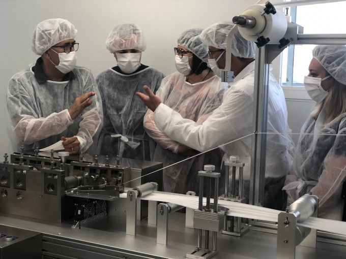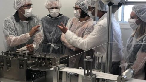 La visita a Mila Rosa, en la que también participaban varios regidores y el subdirector de AITEX, Vicent Cambra, era guiada por el gerente de la empresa, Miguel Àngel Molina, quien agradecía el espaldarazo recibido por el Ayuntamiento y la Consellería de Innovación en su apuesta por la reconversión ante la crisis. Molina explicaba que la empresa ha estado trabajando en un proyecto de investigación con AITEX para desarrollar una máquina para fabricar mascarillas, así como nanofibres y tejidos técnicos para las mismas. "Mila Rosa" hizo un ERTE que cerró dos semanas después, habiendo contratado además gente posteriormente y con previssió de seguir ampliando el personal, para dar salida a una producción de 5.000 mascarillas por hora que tiene como prioridad atender las necesidades de autoabastiment del mercado nacional.